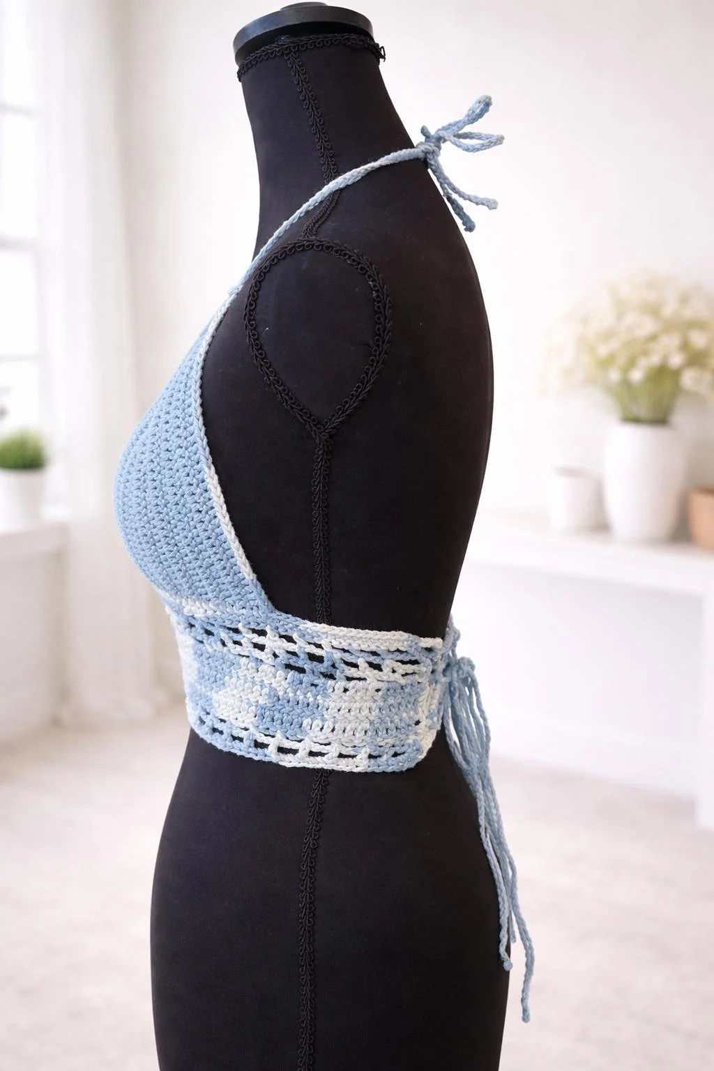 Turn heads in this handcrafted 100% cotton crochet halter top, designed for festivals, beach days, and carefree summer vibes. Made with soft, breathable cotton yarn, this blue and white boho crop top features a flattering deep V neckline and an adjustable lace-up back for the perfect custom fit.