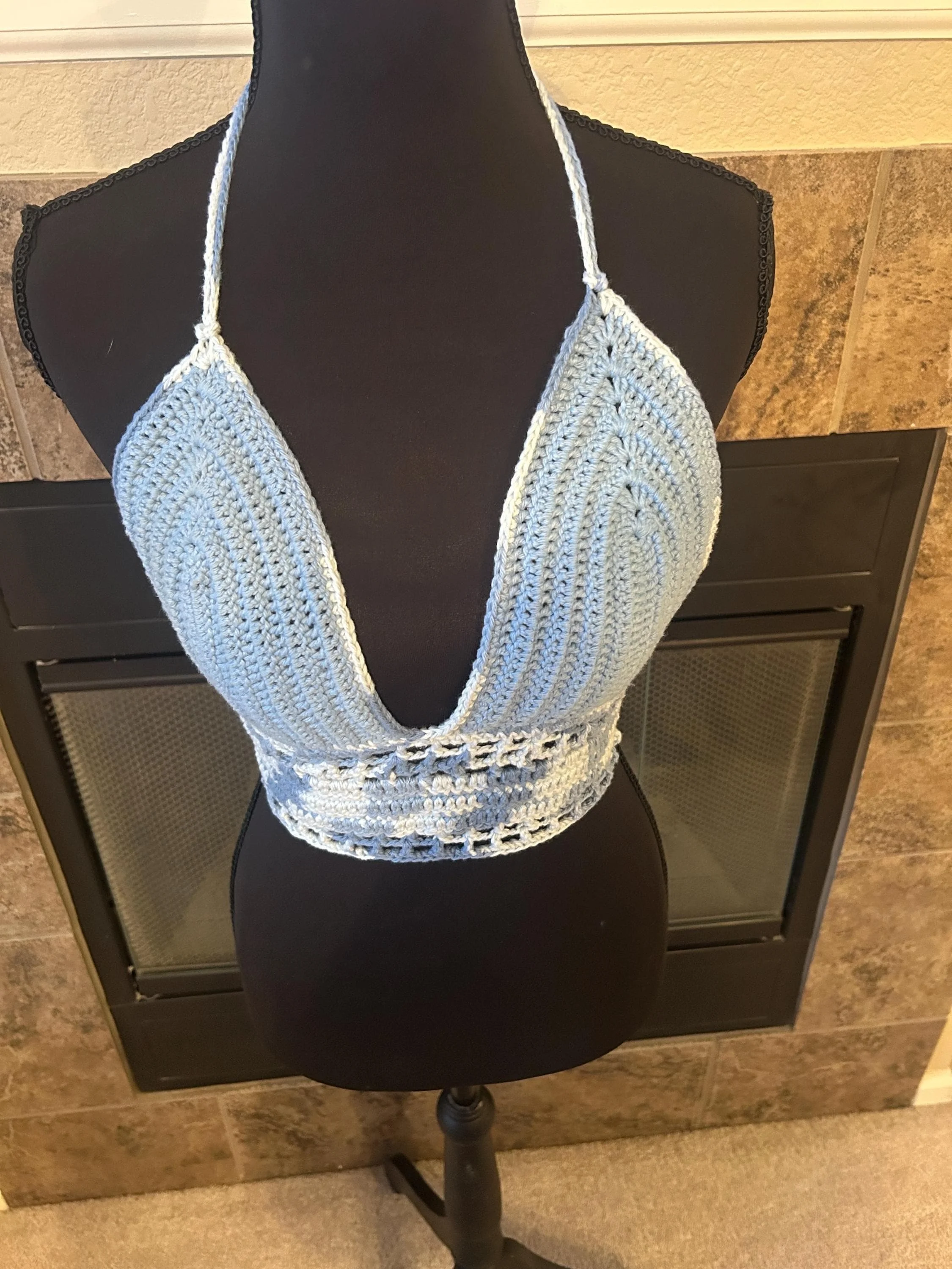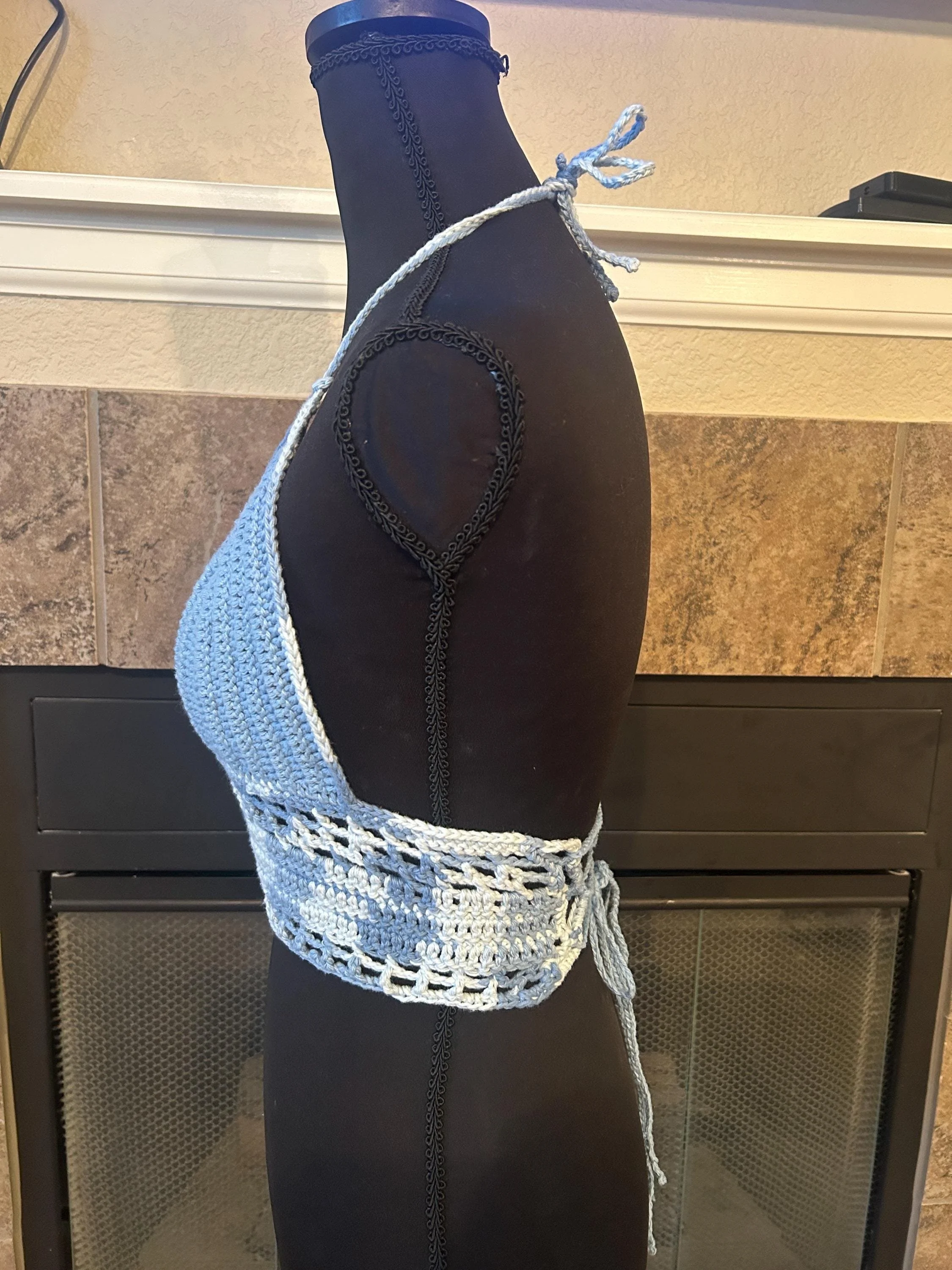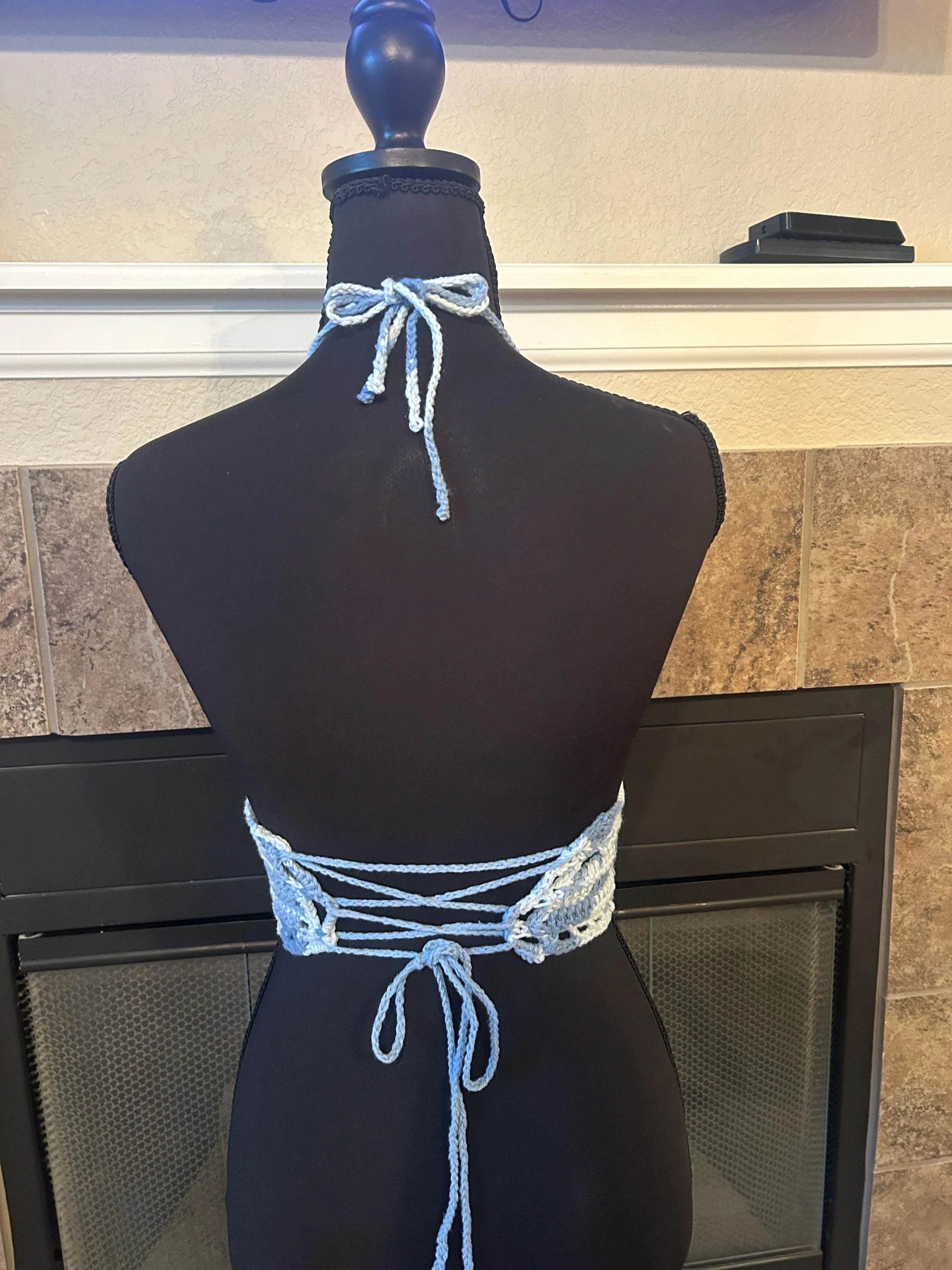 Details: • Size small to medium • Handmade with soft, breathable cotton yarn • Blue with white accent trim • Adjustable neck and lace-up back for custom fit • Lightweight & comfortable for all-day wear • Ideal for festivals, concerts, beachwear, and summer outfits • Unique handmade piece
