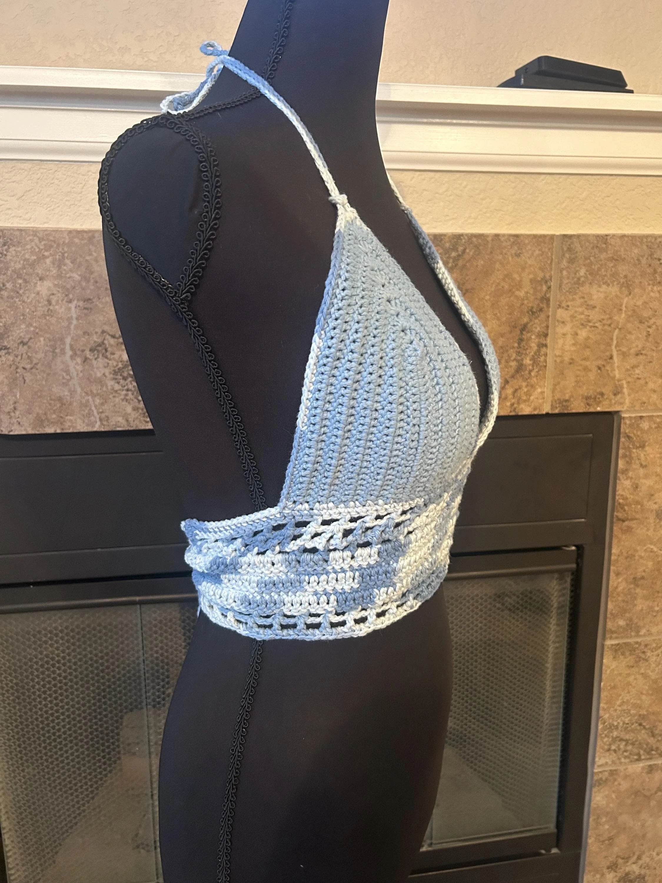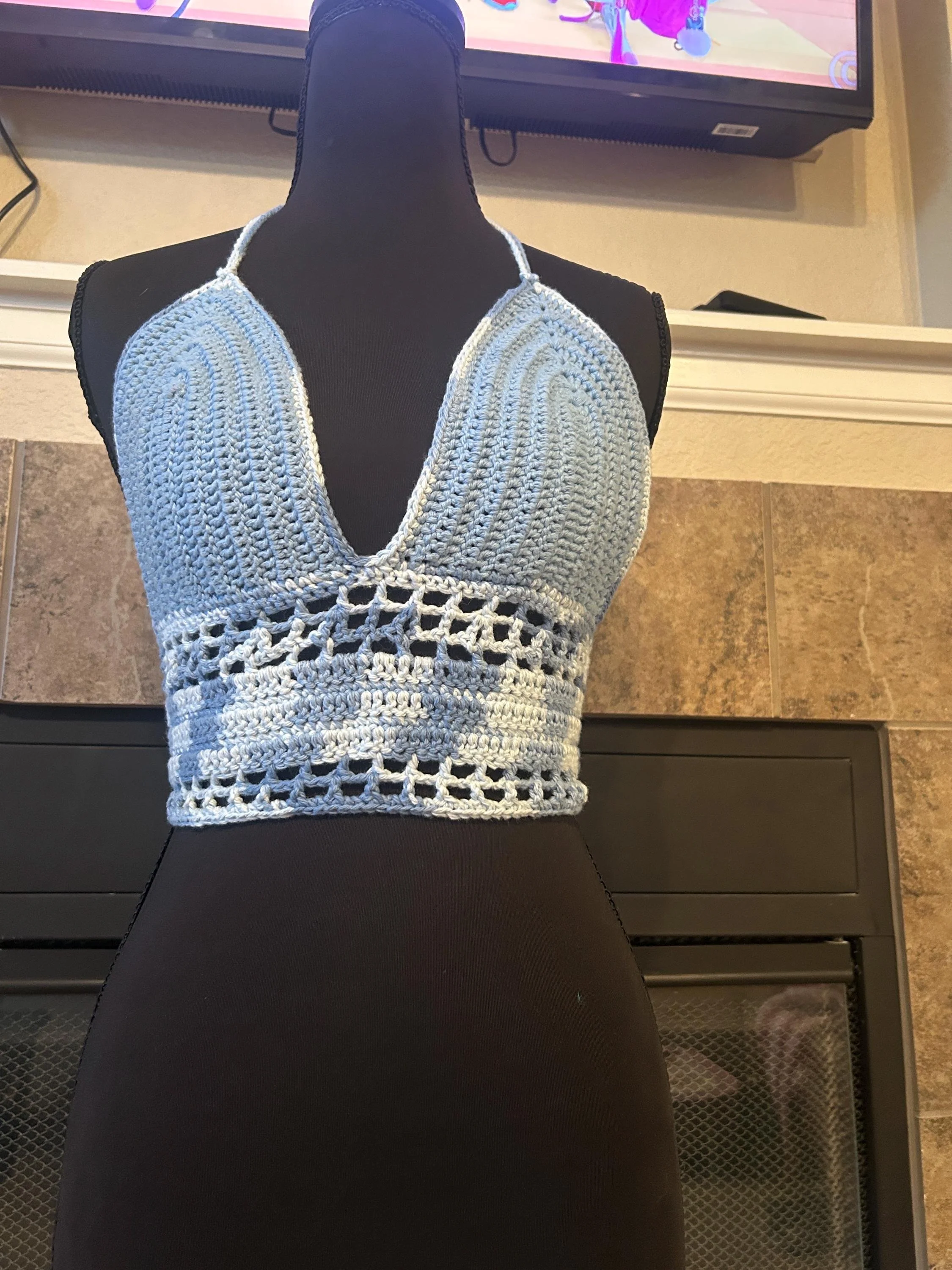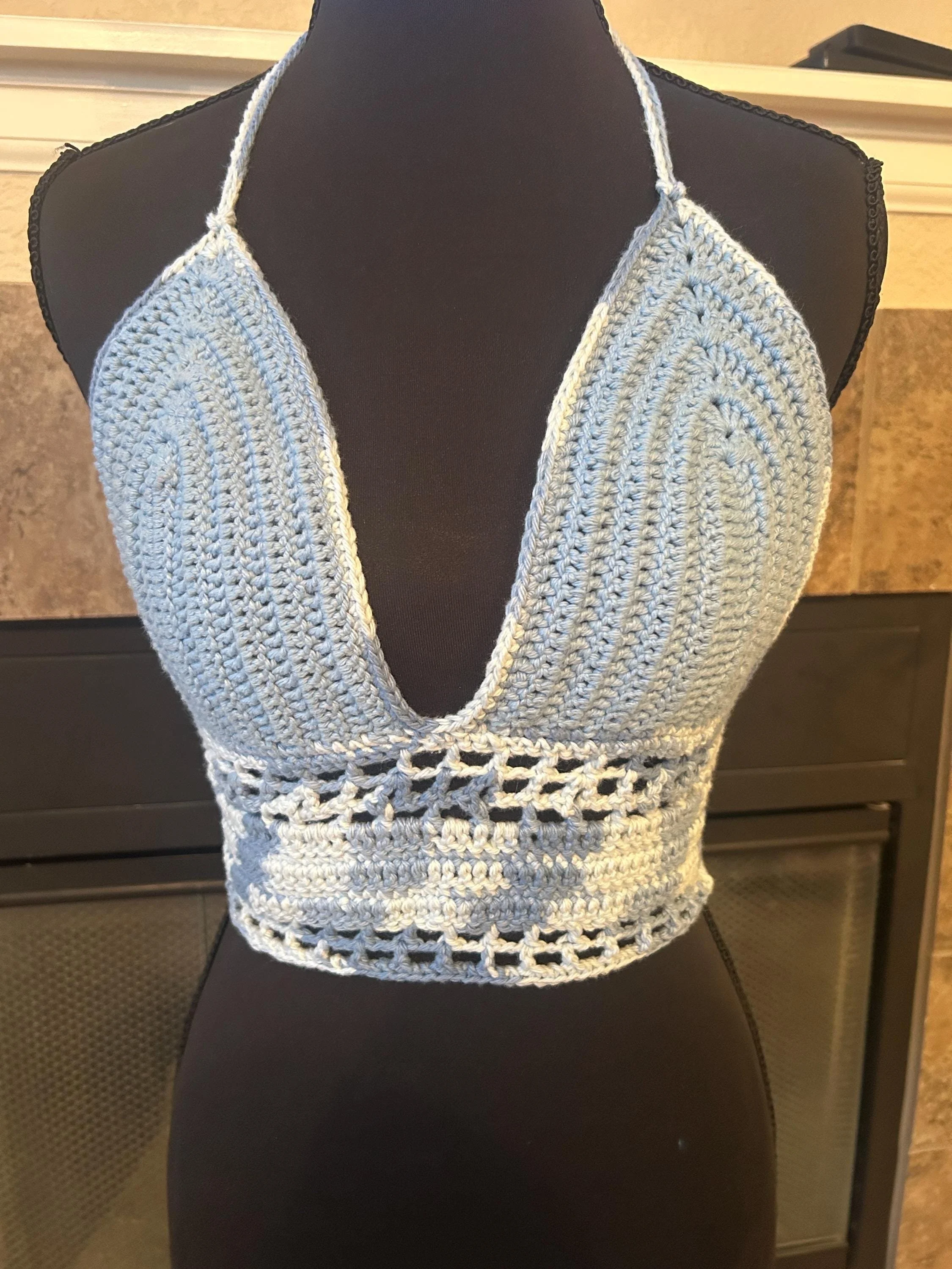 Details: • Size small to medium • Handmade with soft, breathable cotton yarn • Blue with white accent trim • Adjustable neck and lace-up back for custom fit • Lightweight & comfortable for all-day wear • Ideal for festivals, concerts, beachwear, and summer outfits • Unique handmade piece