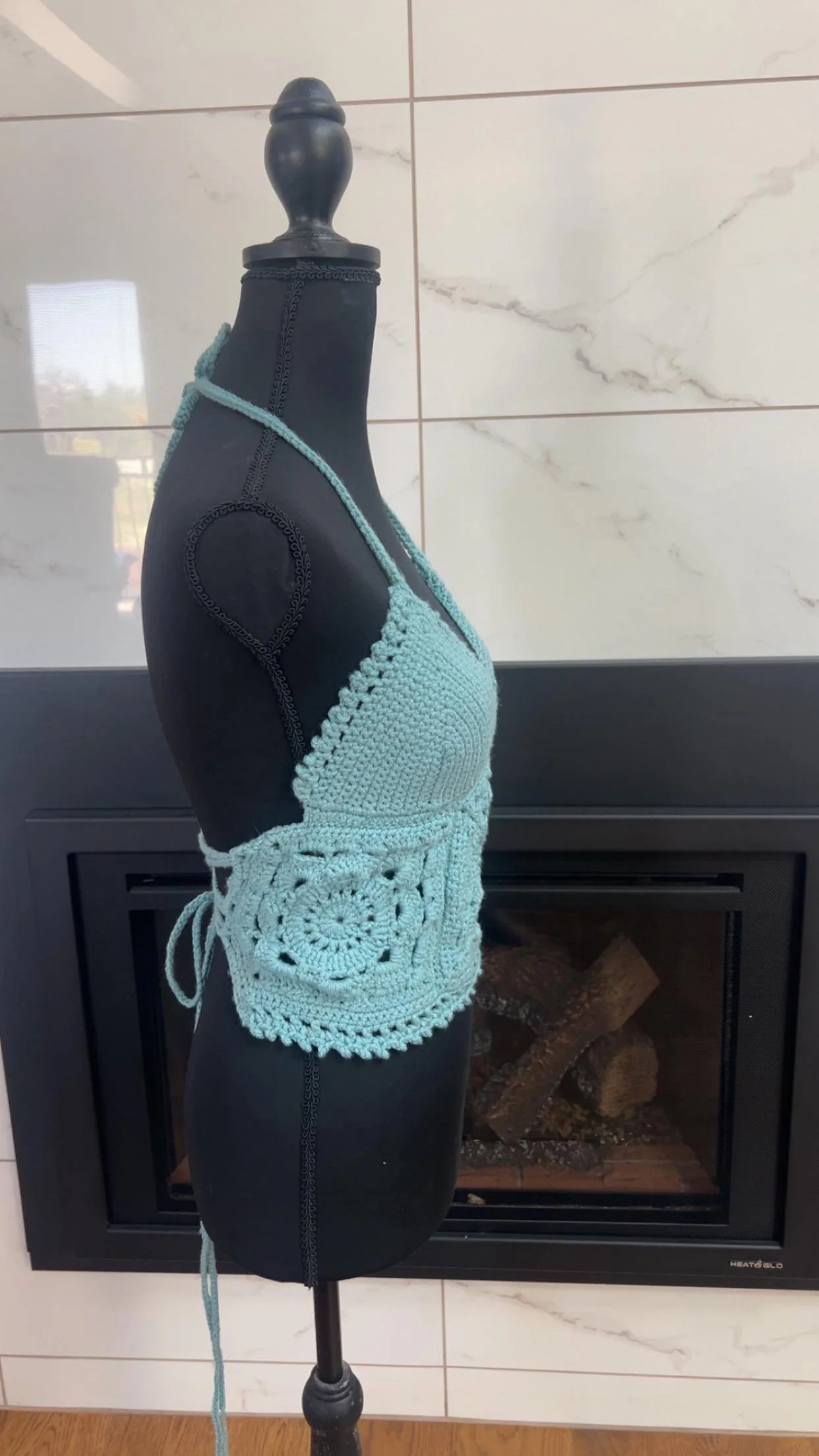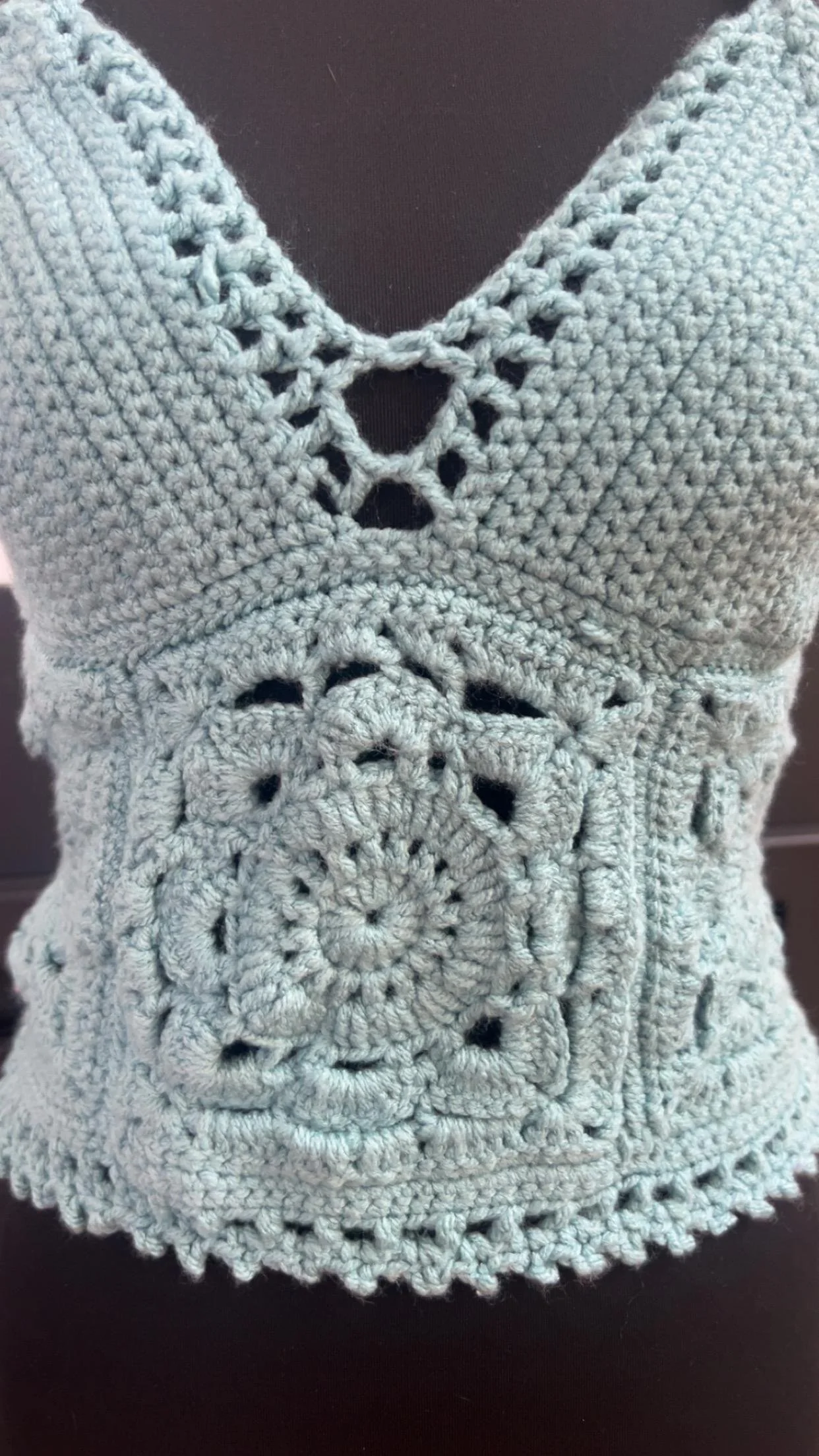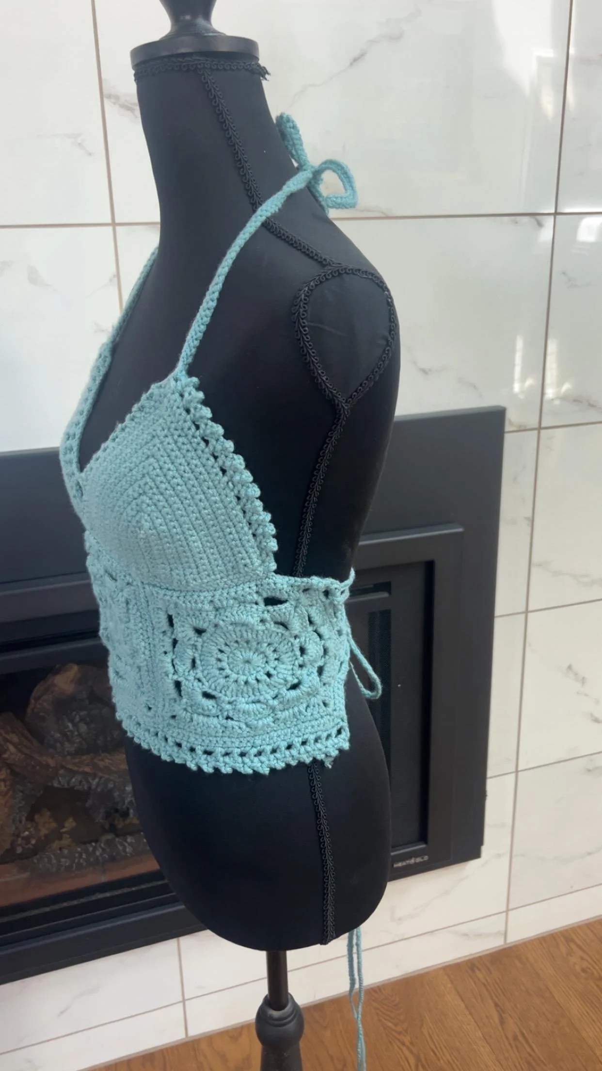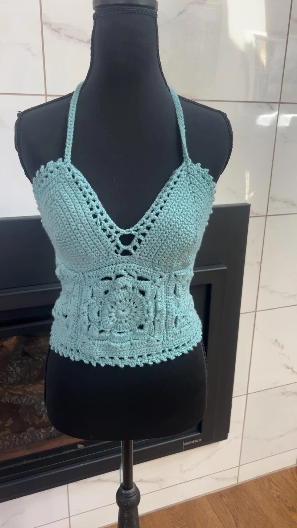 This dreamy sky blue crochet halter top is handmade with love and perfect for summer! Featuring a flattering V neckline, intricate granny square floral detail at the waist, and a soft, breathable acrylic yarn, it’s the perfect mix of cute and comfy. The halter tie allows for adjustable fit and support. size B or C