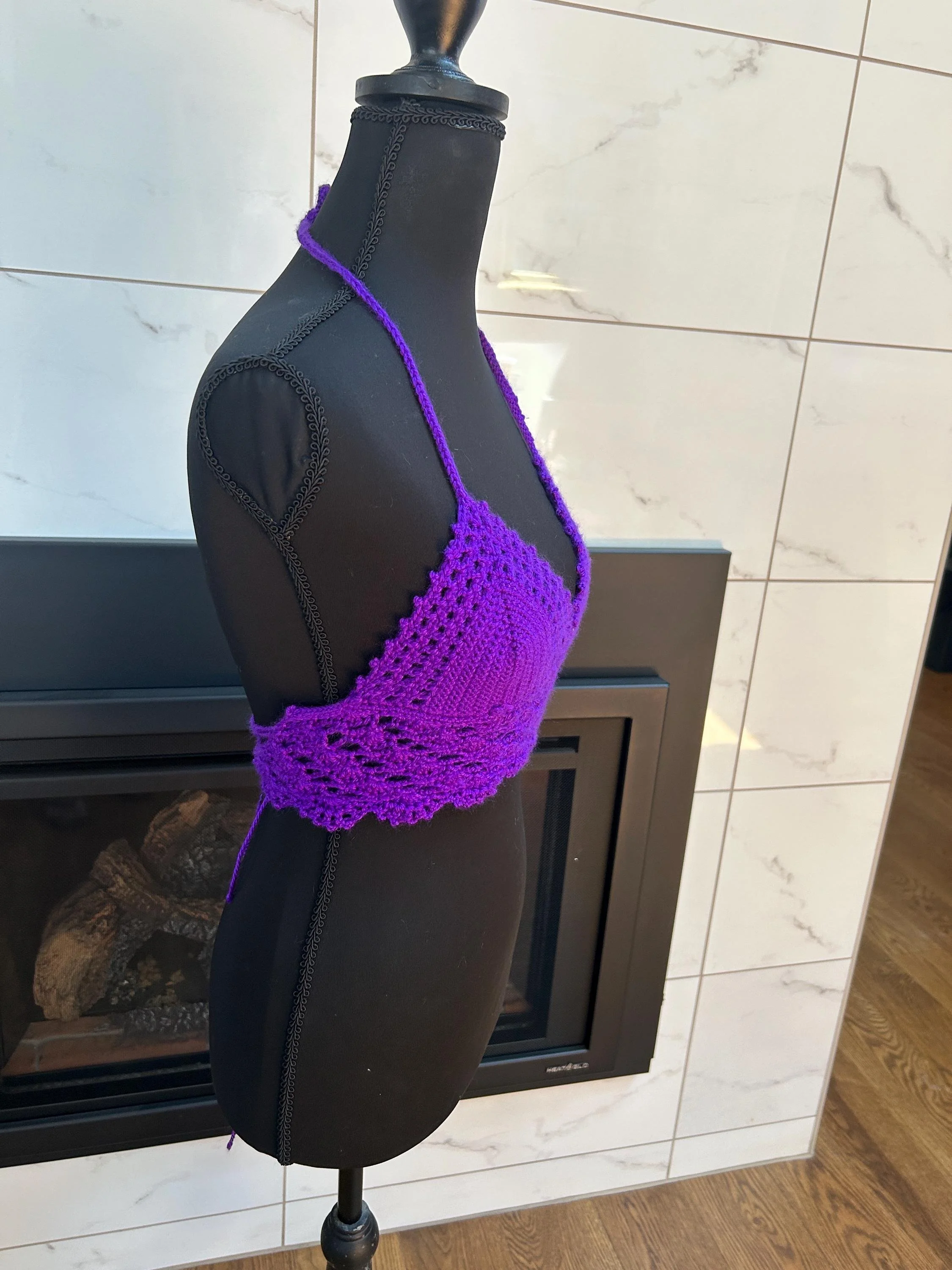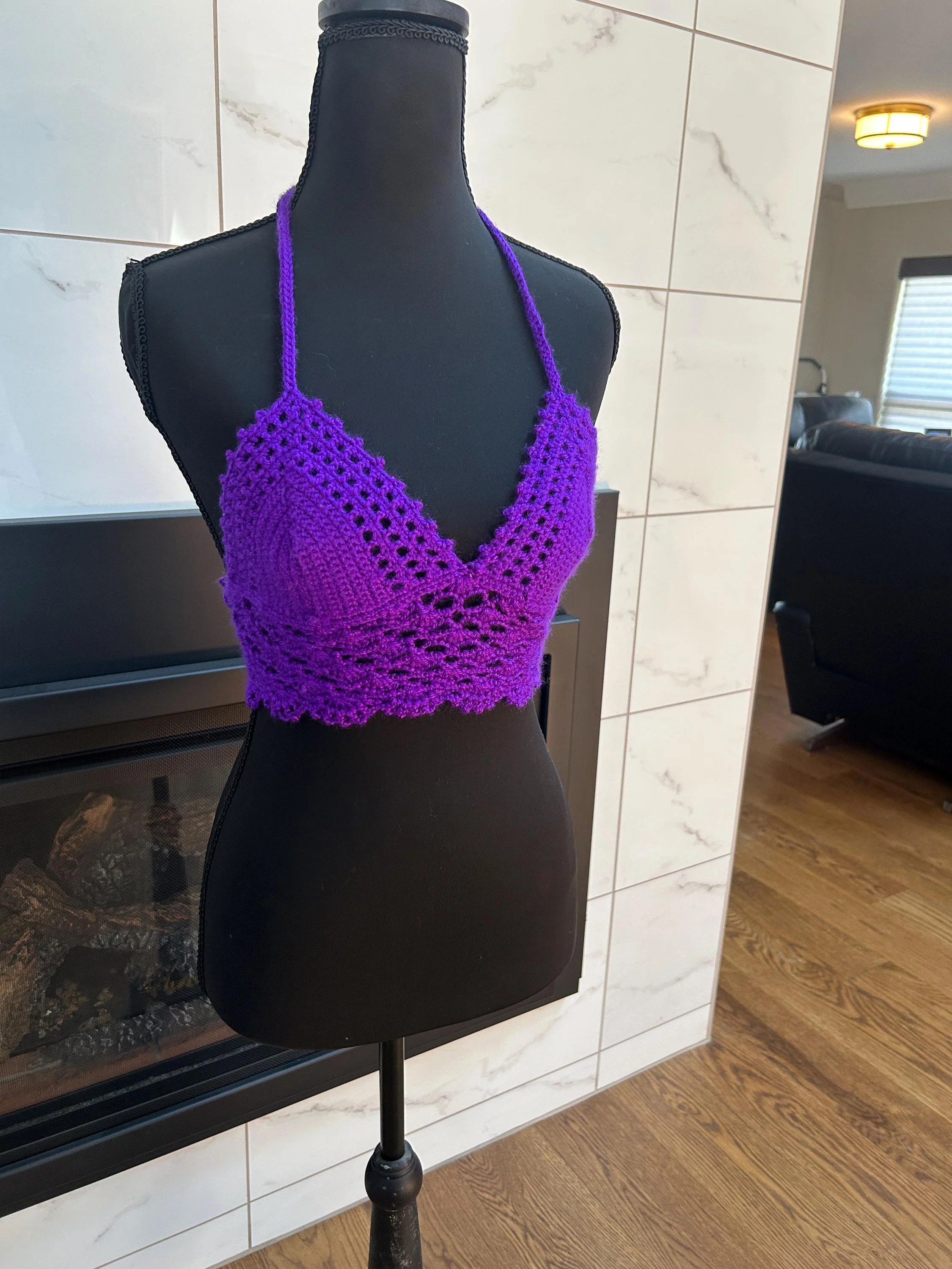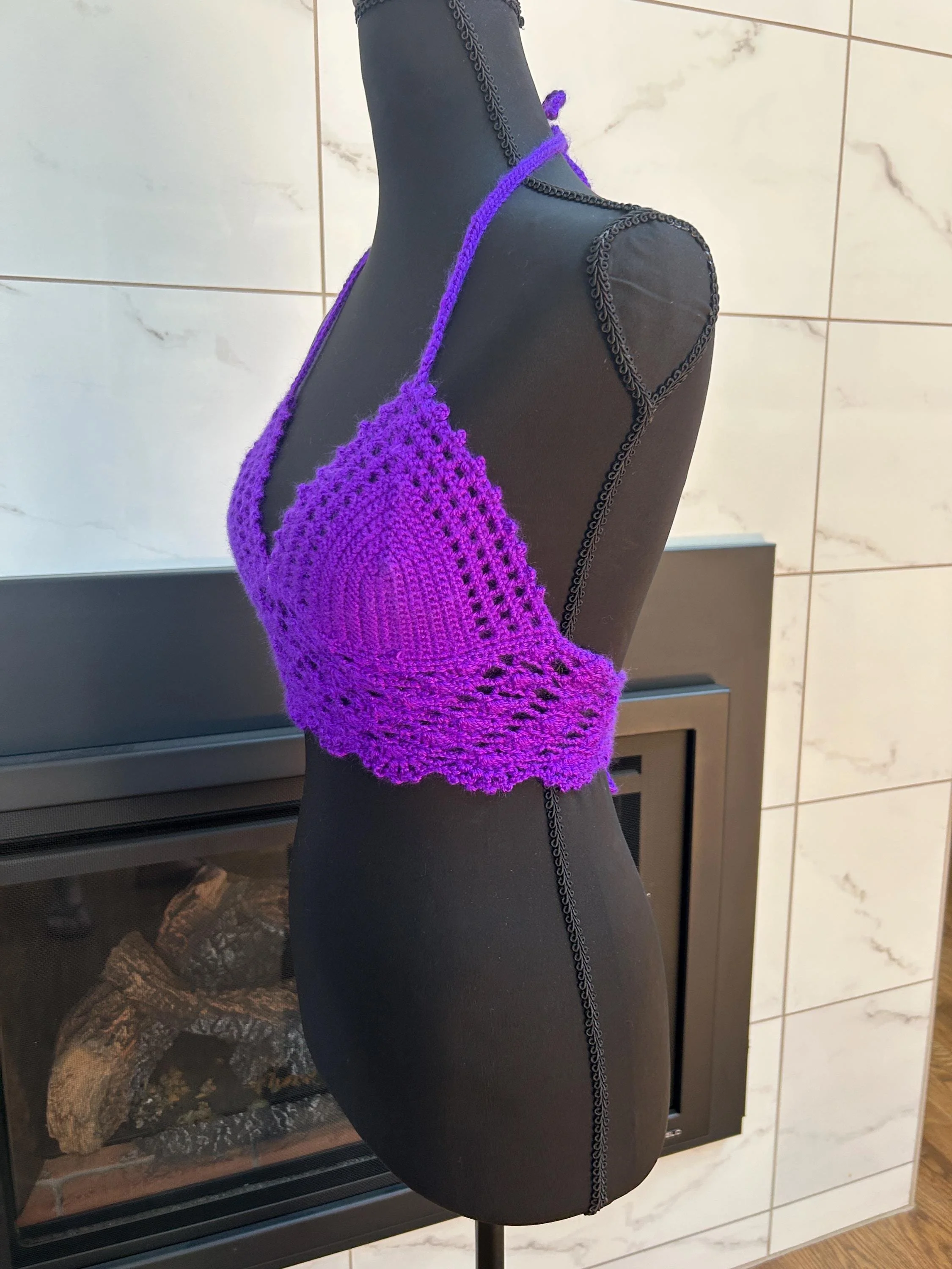 Details: • Size: Best fits A to small B cup (mannequin is an A) • Handmade with soft, high-quality yarn • Stretchy and adjustable halter neck and back ties • Beautiful scalloped lace bottom for a flirty, feminine finish