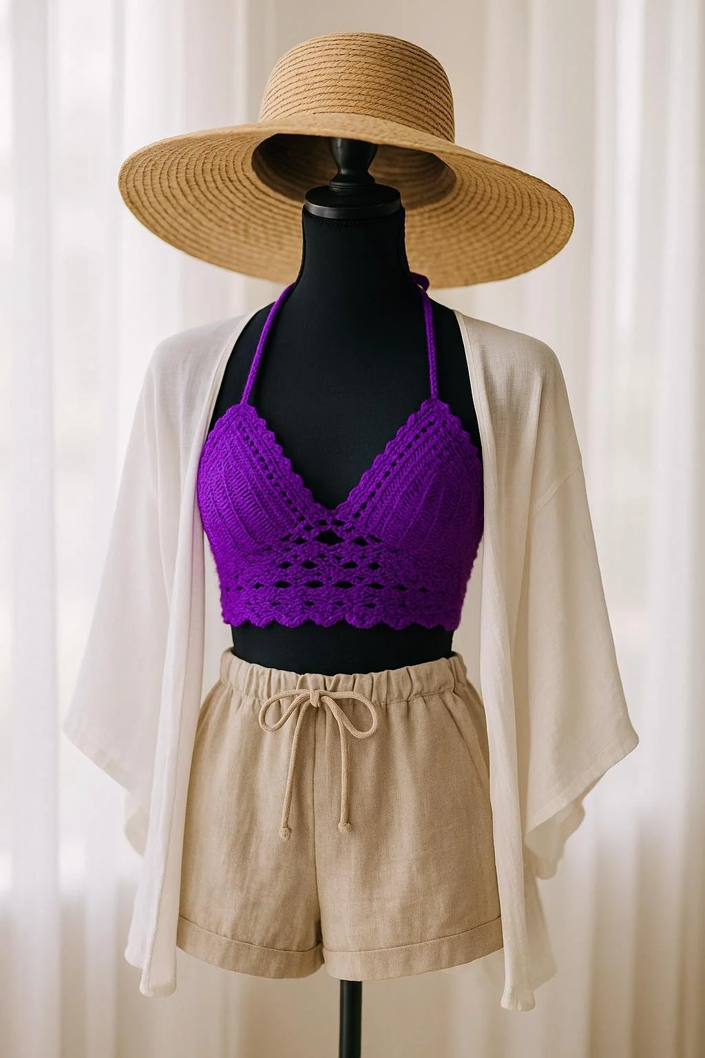 This stunning handmade crochet halter top is a bold, vibrant purple that’s perfect for summer vibes! Featuring a lacy, boho-inspired design and secure halter ties, it’s flattering, breathable, and ideal for festivals, beach days, concerts, or layered under a denim jacket for everyday boho style.
