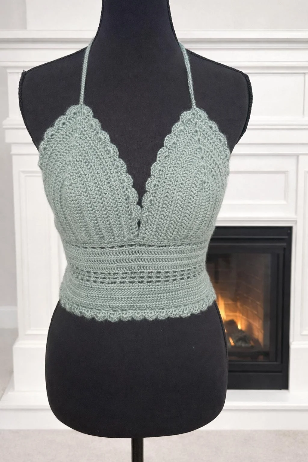Sage Green Crochet Halter Top | Boho Festival Bralette Crop Top | Handmade Crochet Bikini Top | Adjustable Tie Back | Summer Beach Top