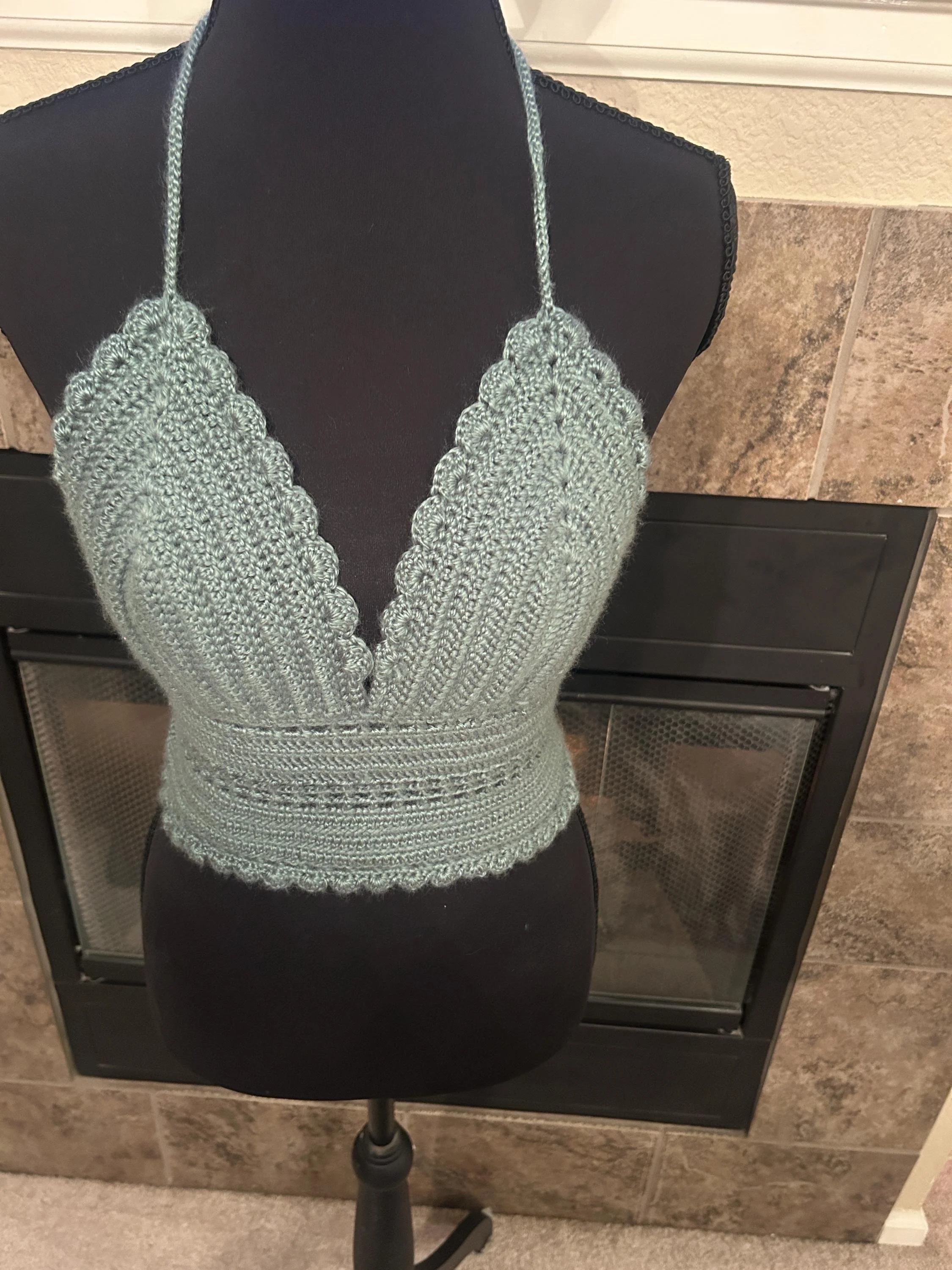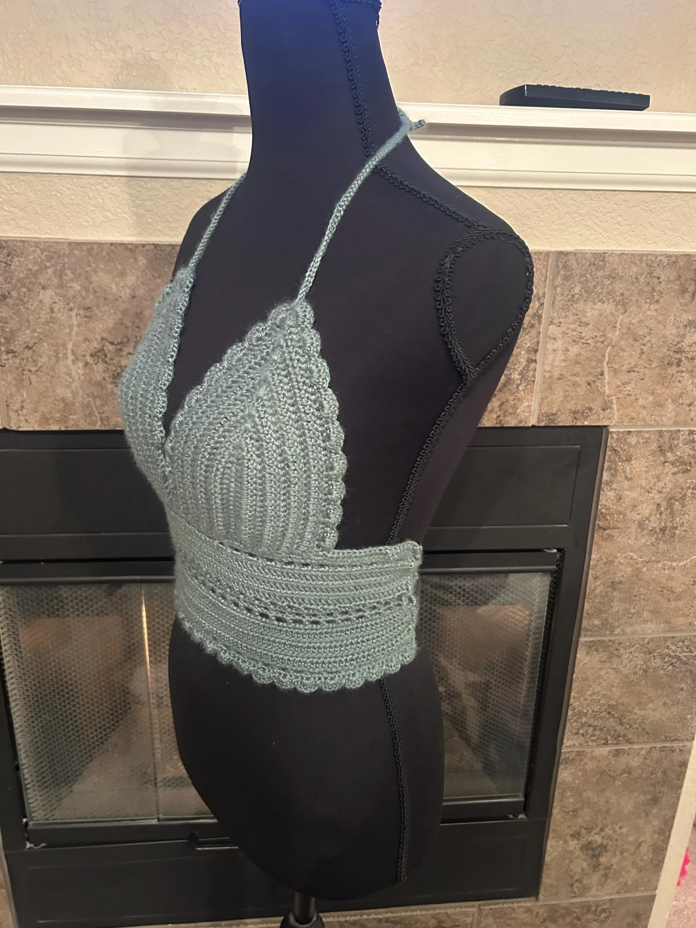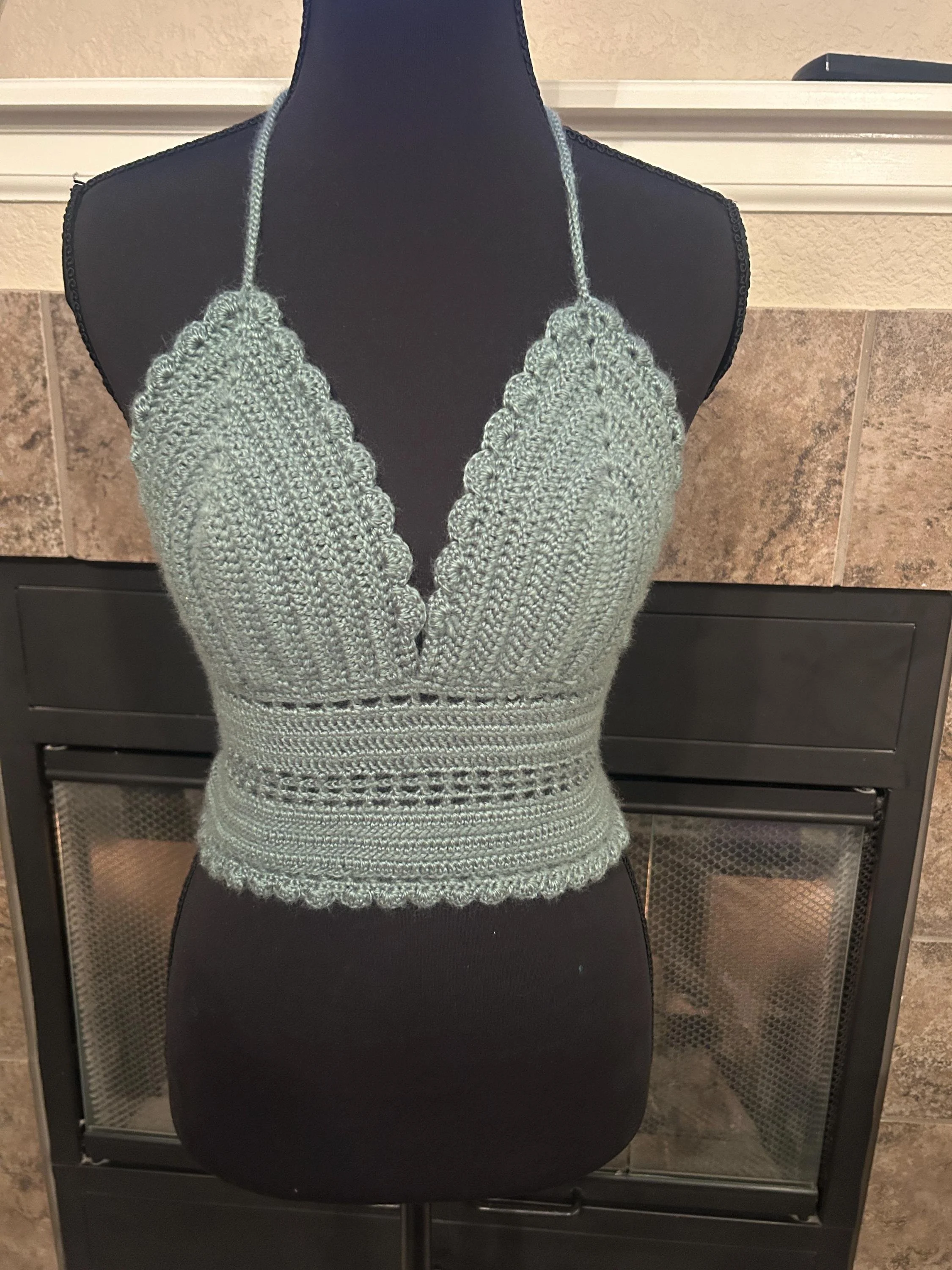 Details • Color: Sage/Mint Green (pictured) • Style: Halter bralette / crop top • Yarn: Acrylic • Fit: Adjustable tie neck + tie back • Availability: READY TO SHIP (no wait!) • Size: small/ medium Care Instructions