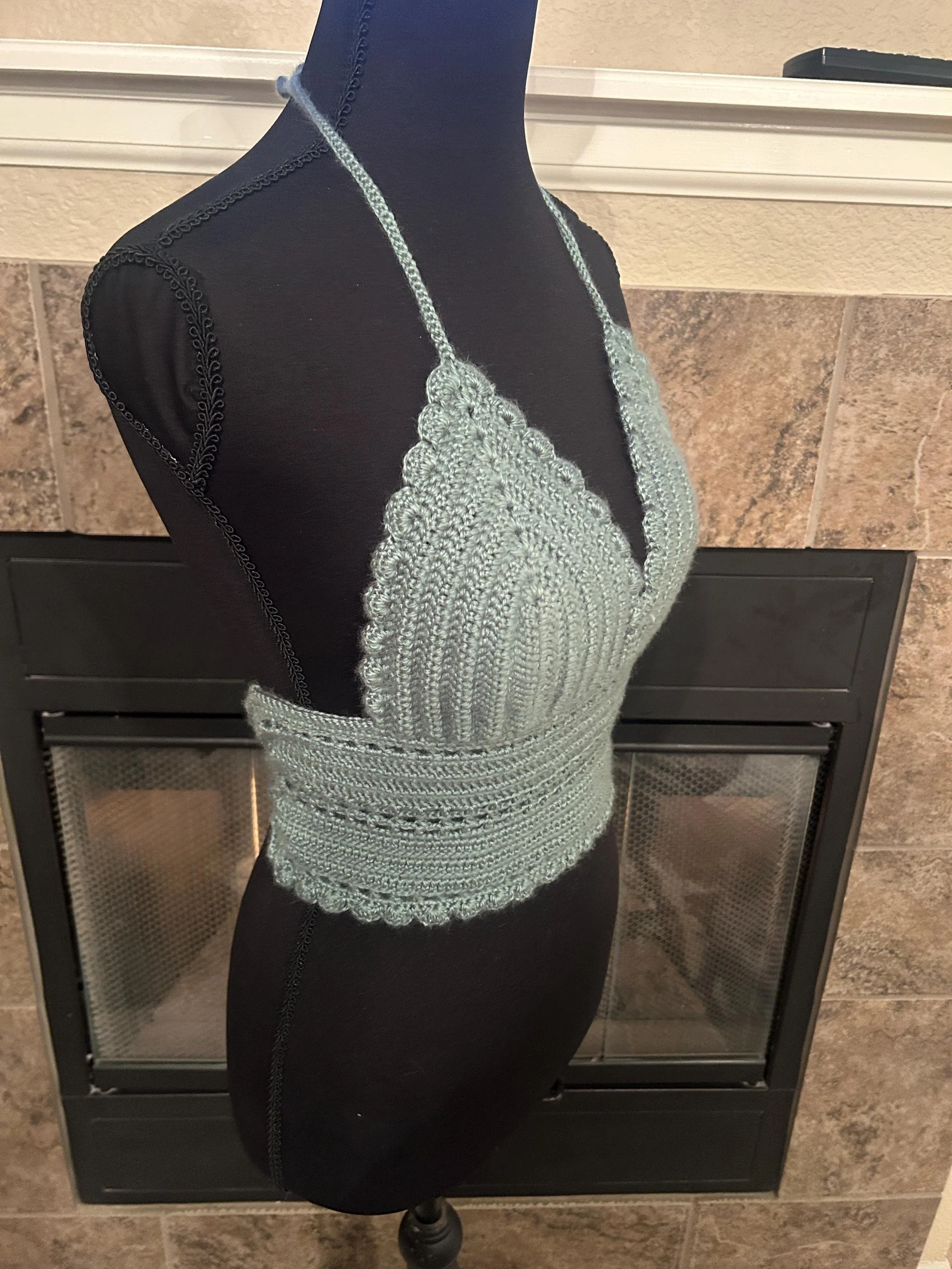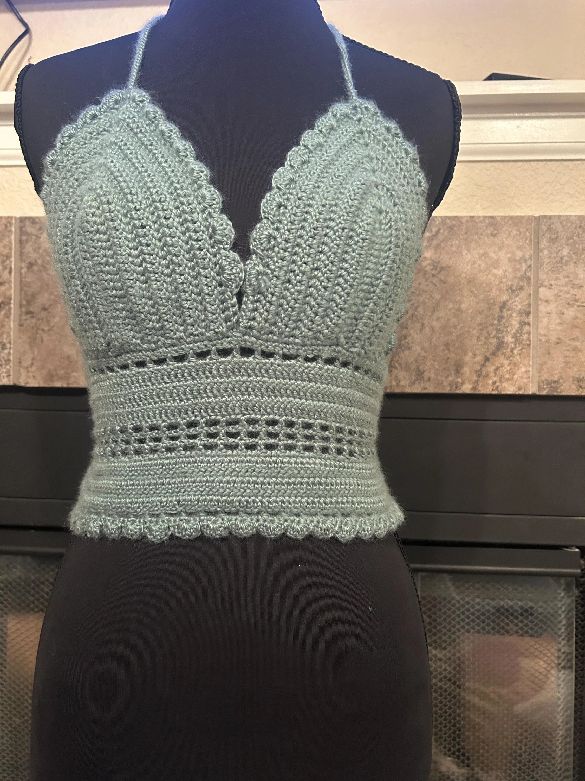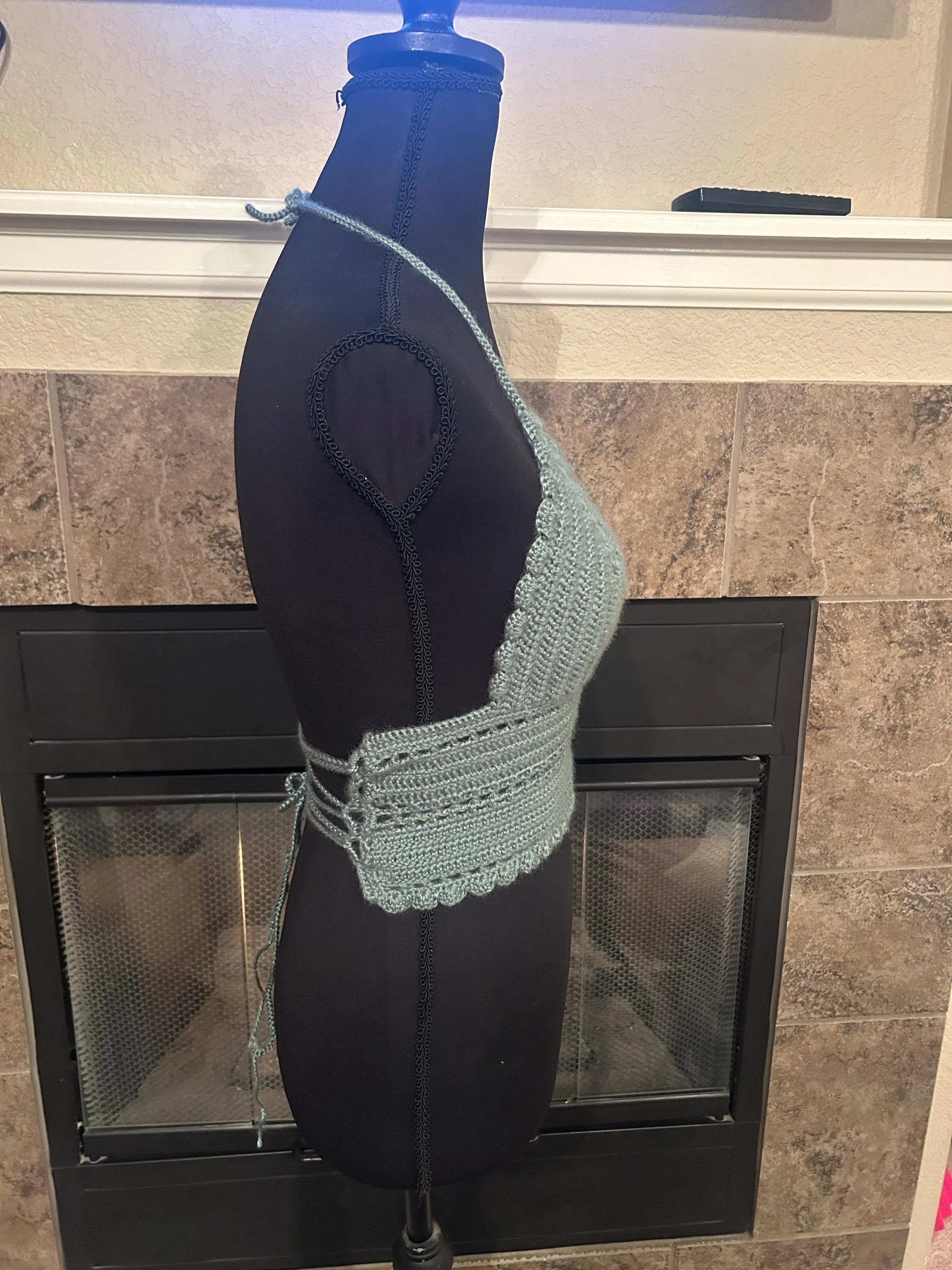 Details • Color: Sage/Mint Green (pictured) • Style: Halter bralette / crop top • Yarn: Acrylic • Fit: Adjustable tie neck + tie back • Availability: READY TO SHIP (no wait!) • Size: small/ medium Care Instructions