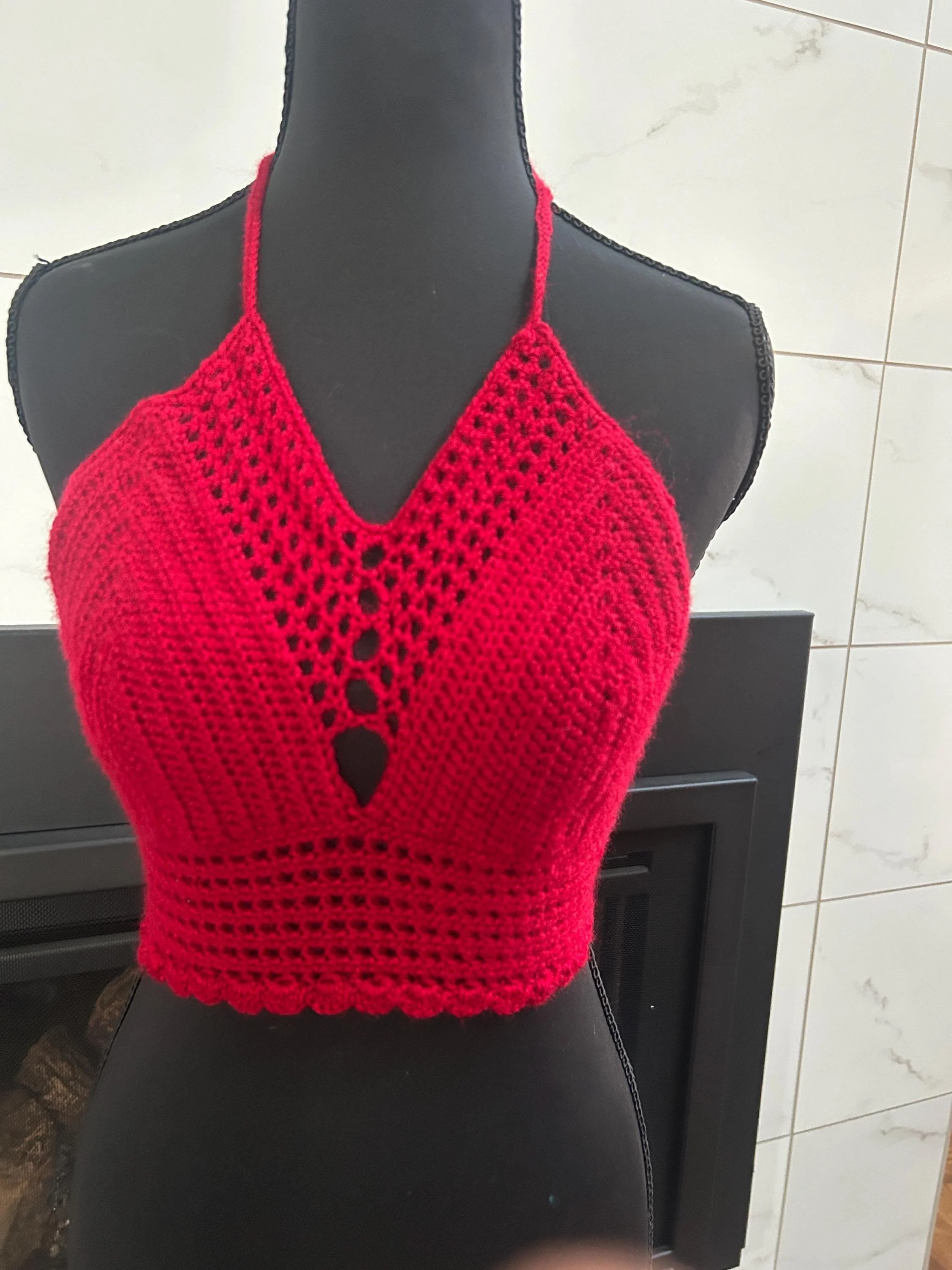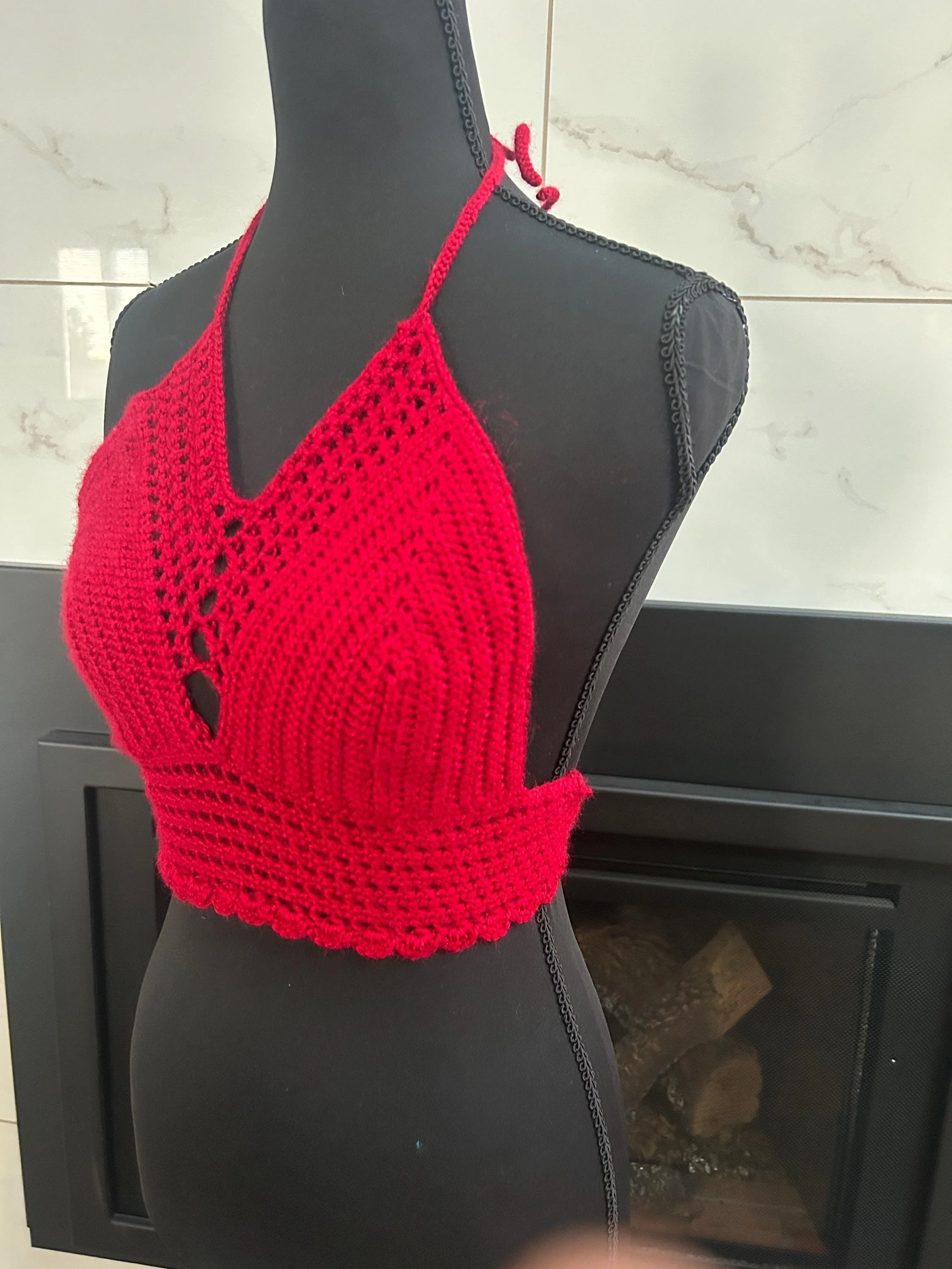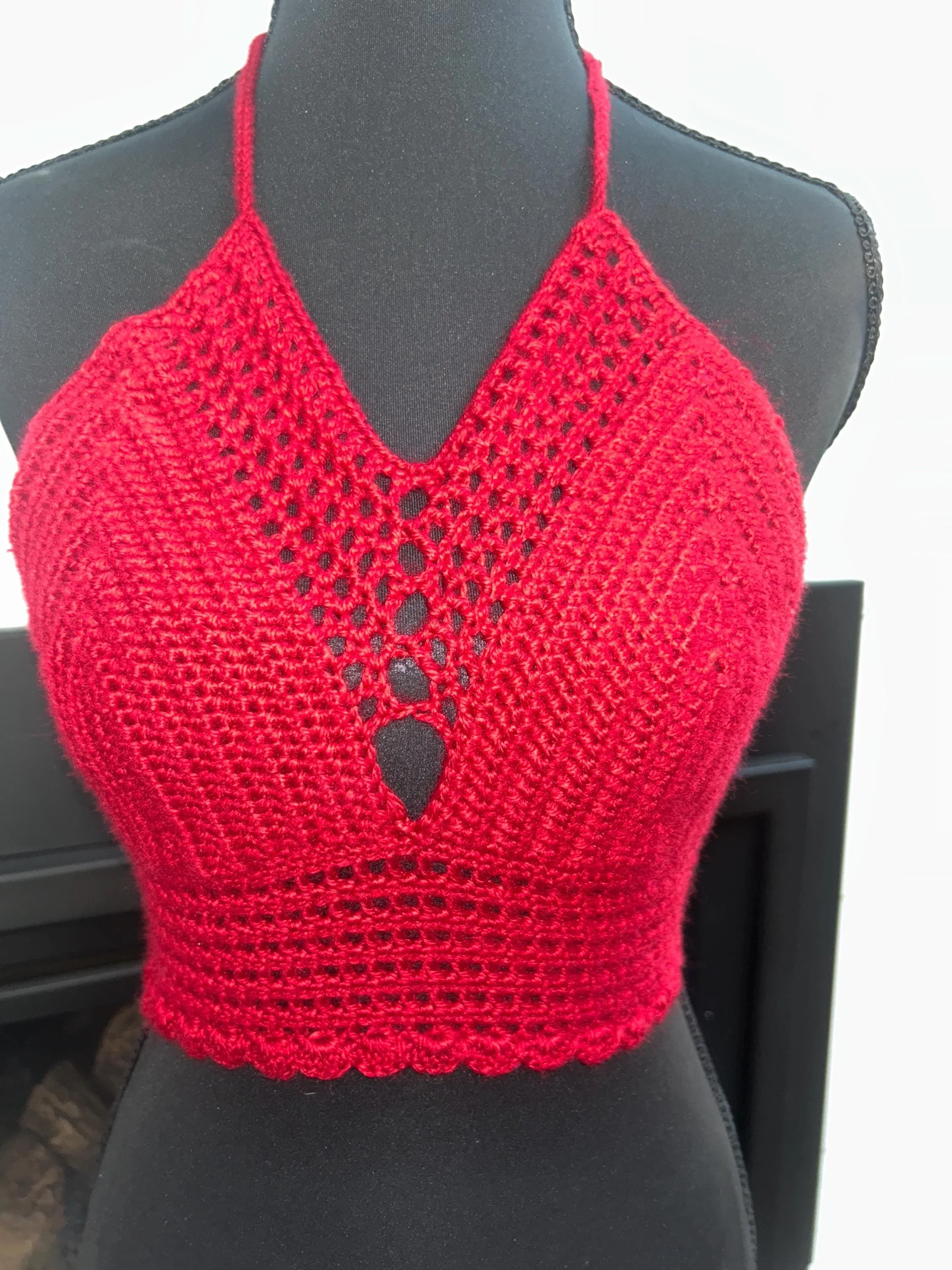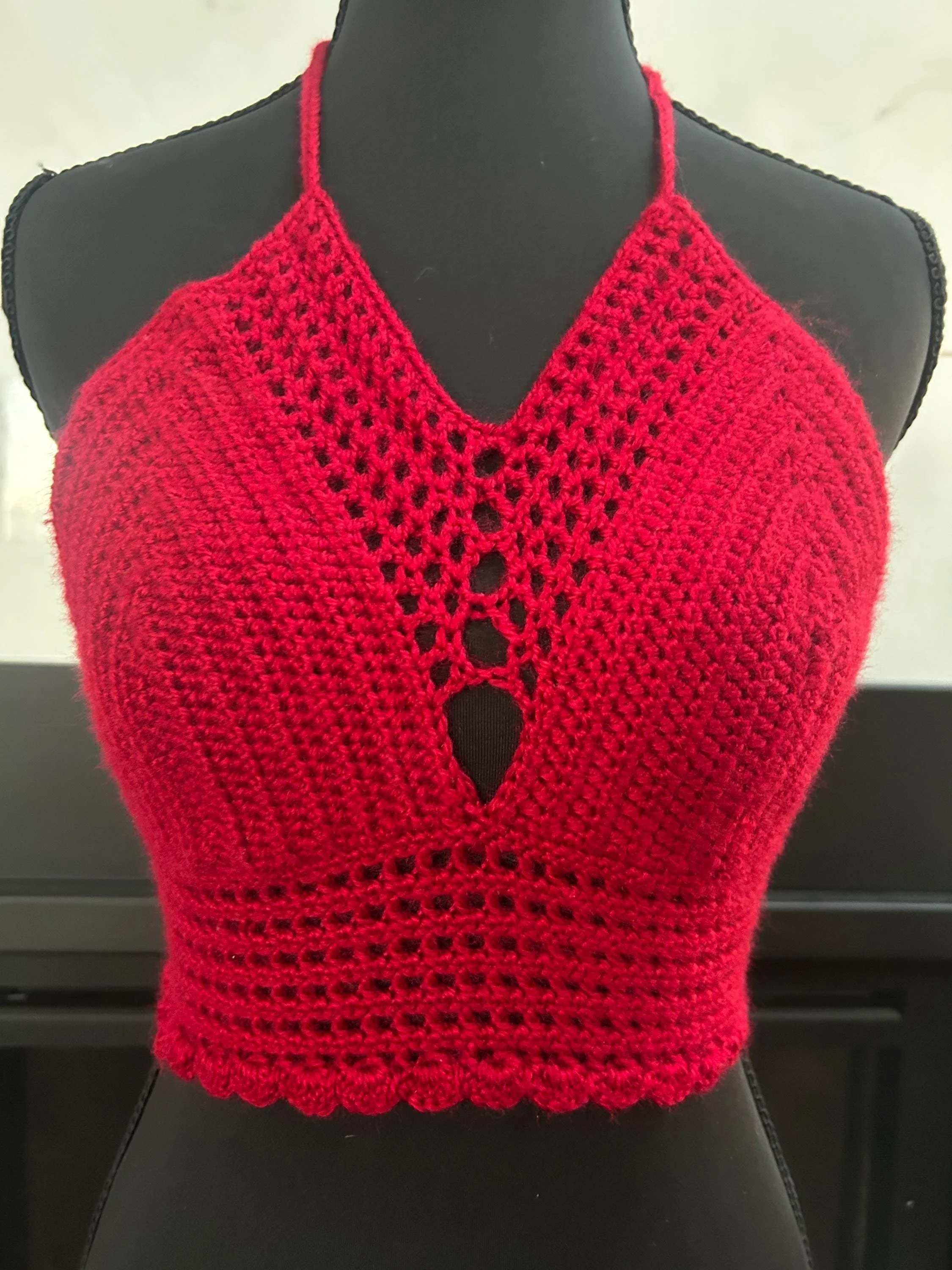 ✨ Details: • Fits approximately A–B cup (stretchy for comfort and flexibility) • Adjustable tie-back and neck straps for a custom fit • Handmade using soft, breathable yarn • Eye-catching front keyhole and scalloped hem detail • Made with love by Crazy Rae’s Crochets 🧶