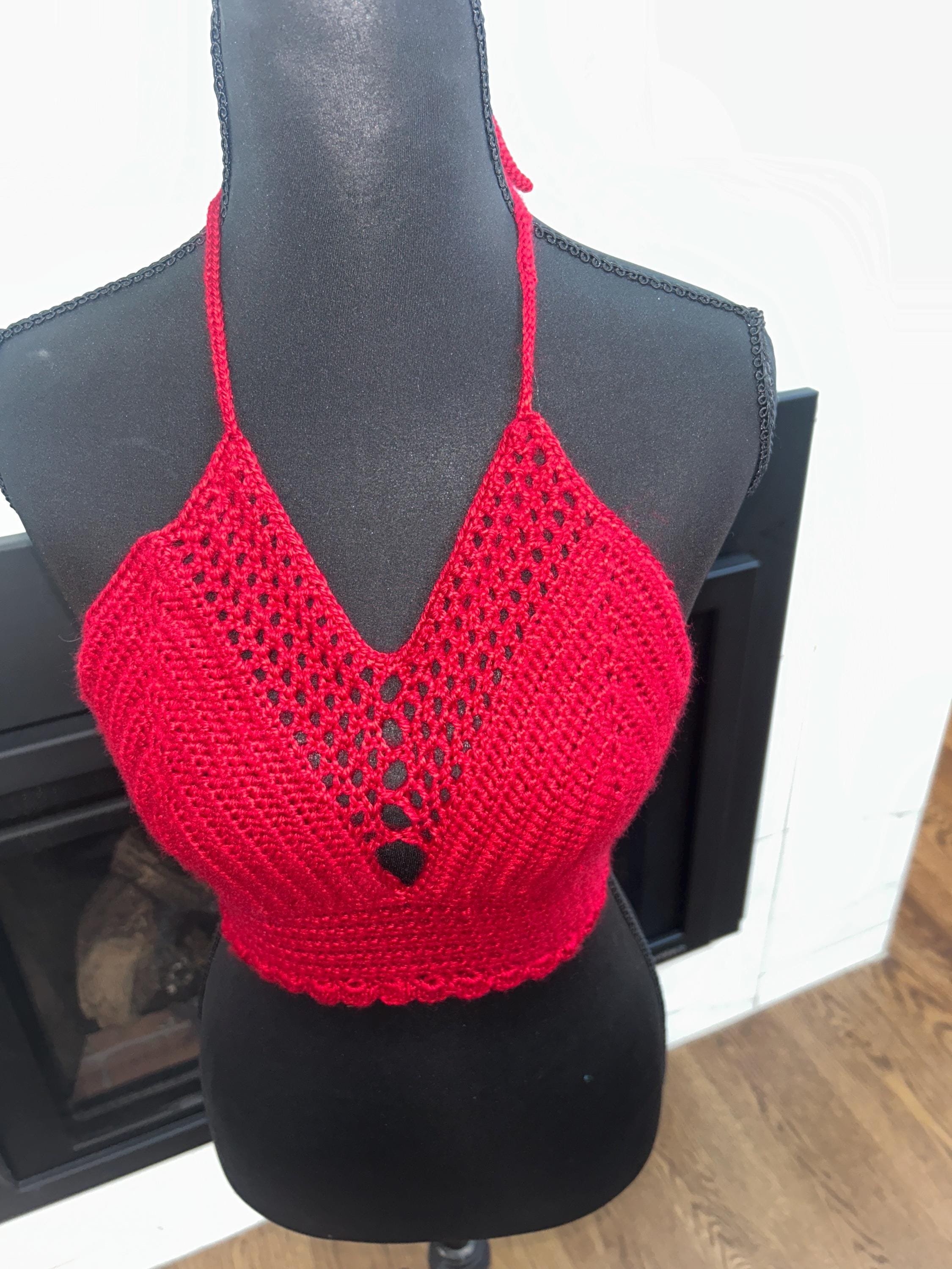 Turn heads in this deep red crochet halter top, handcrafted with love and care. The design features a delicate keyhole front and a textured lace band for a flattering fit that’s both soft and supportive. Perfect for those who love a bold, confident look with a boho twist.