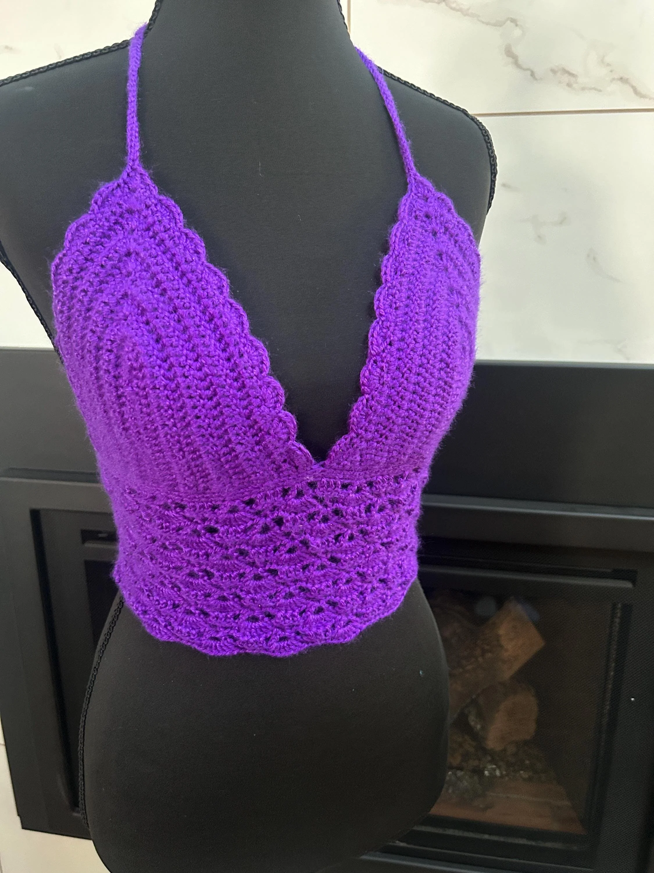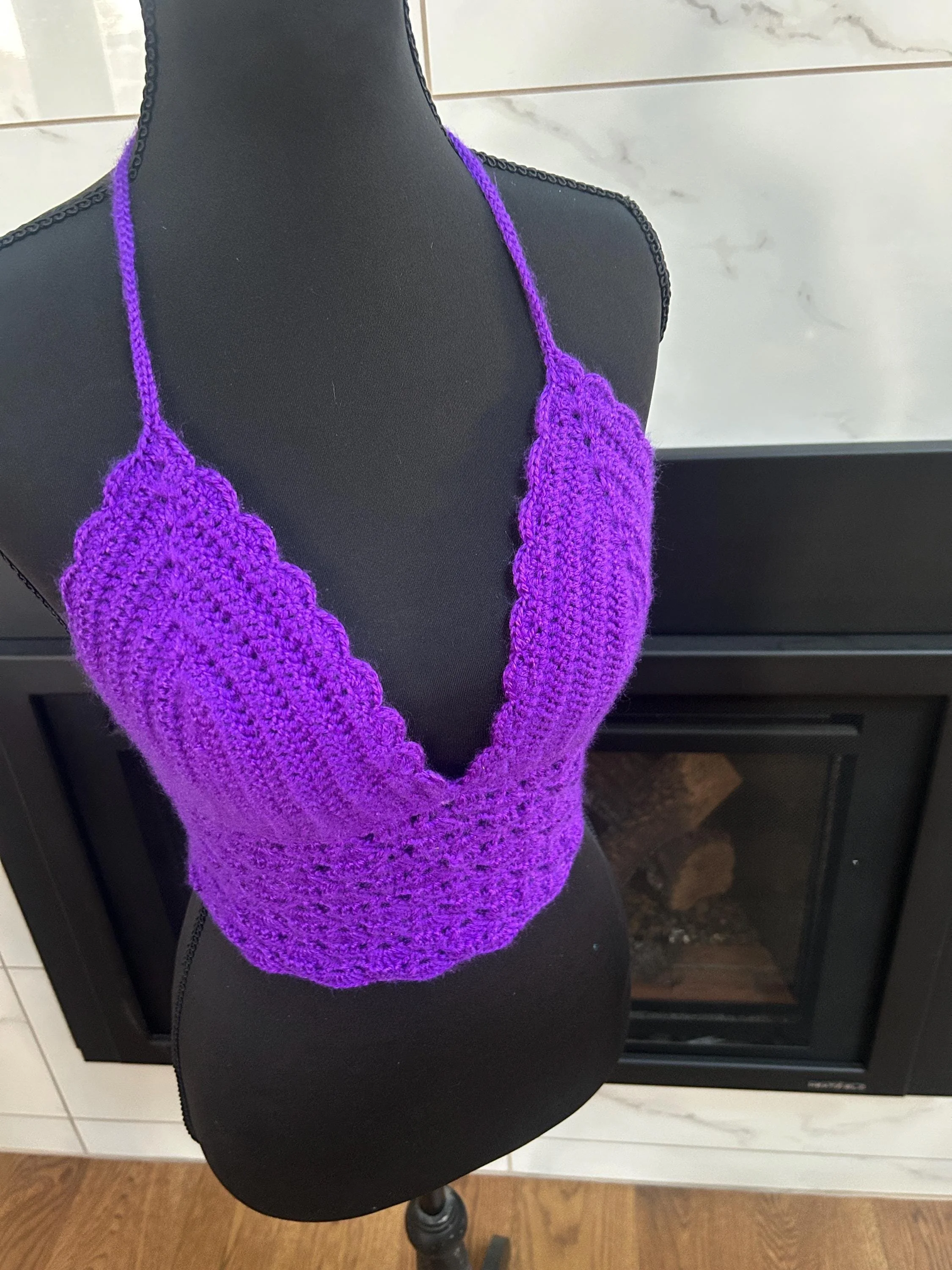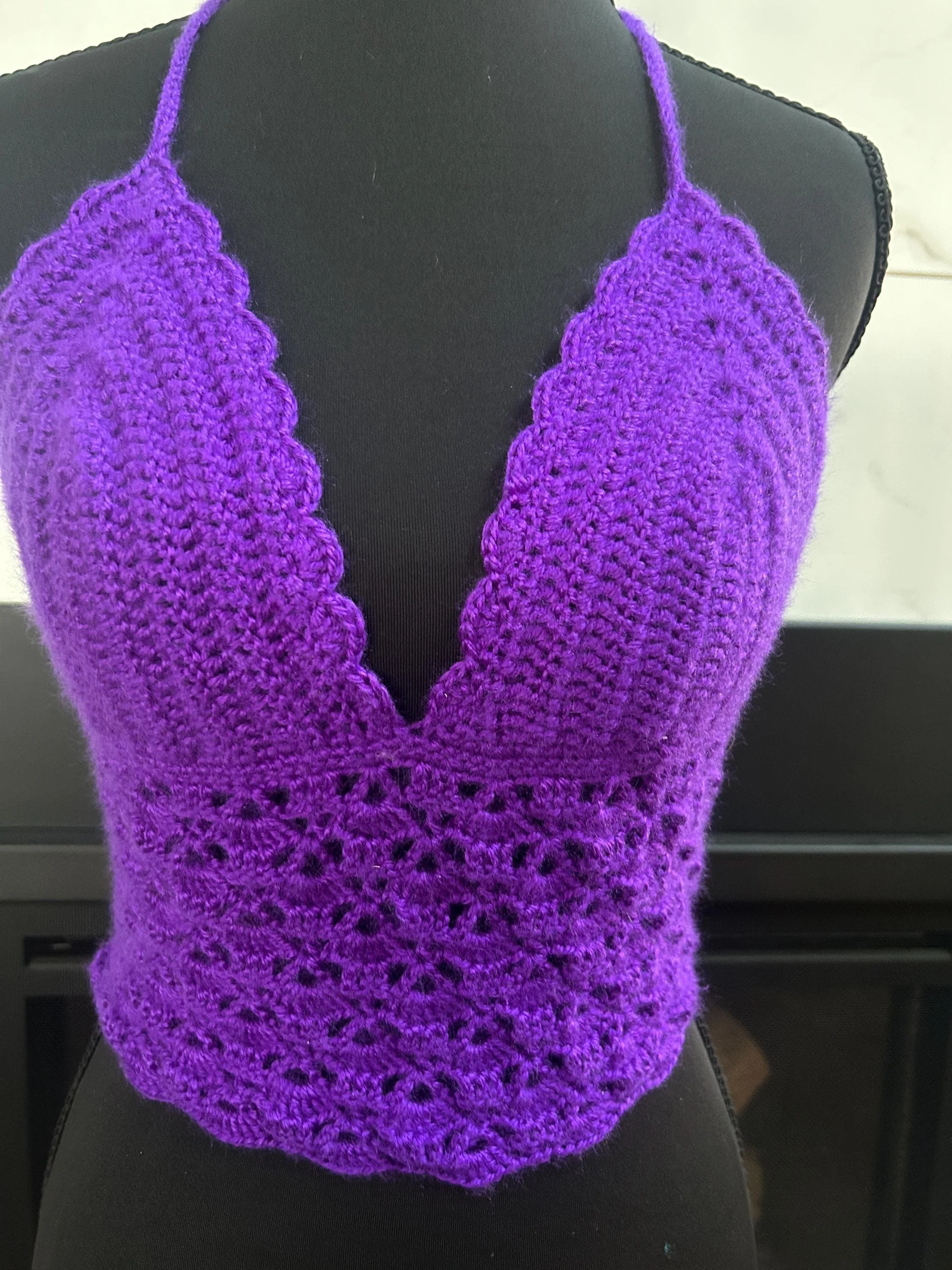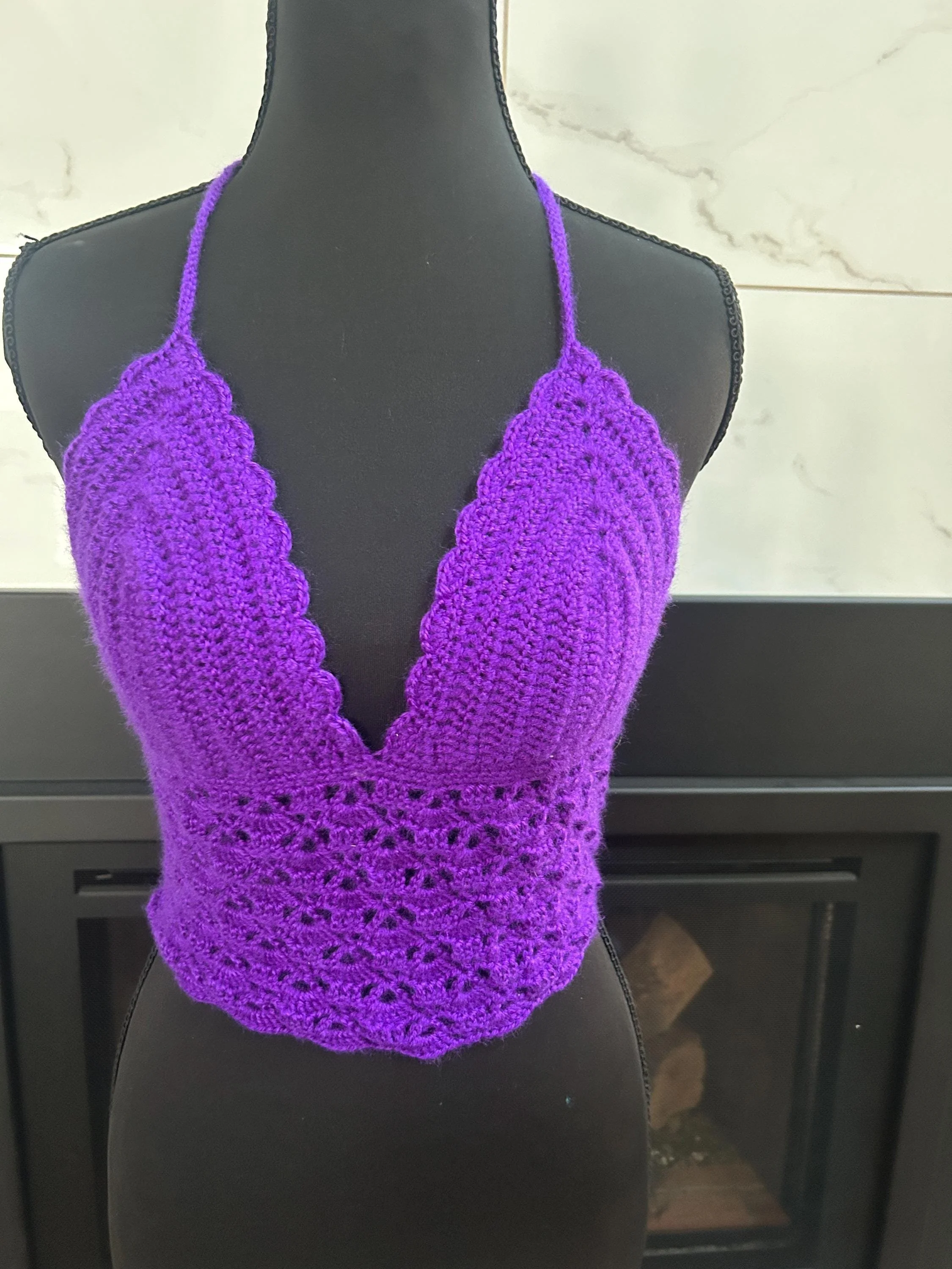 This vibrant deep purple crochet halter top is handmade with love and attention to detail. The scalloped edges and open lacework bottom give it a flattering, feminine fit with just the right amount of coverage and stretch.